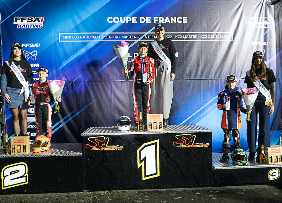 Présent dans la structure depuis moins de deux mois, Valentin a opéré une spectaculaire progression. Excellent 3e aux chronos sur une piste humide, puis 2e de la Course 1 derrière Aaron Bordanova, il s’est ensuite montré le meilleur sur le sec avec trois victoires consécutives, ainsi que deux meilleurs tours. Une belle preuve de solidité et de rapidité. La première marche du podium de cette Coupe de France l’attendait.